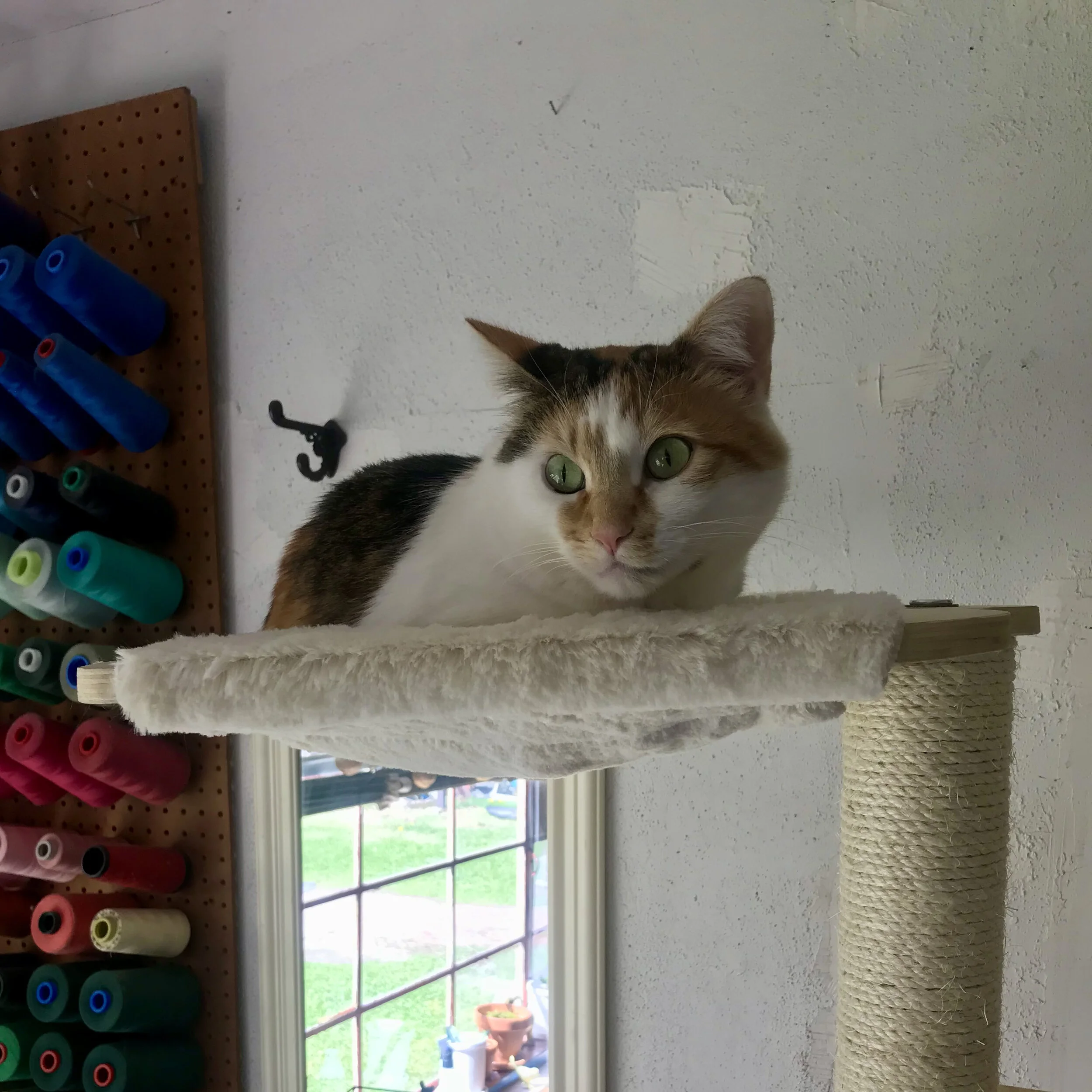 Ranger in her Armarkat 89" Solid Wood Cat Tree hammock perch. A last note: please excuse the dirty textured drywall; its time as a wall form is waning, we have moved out of this 1886 coach house as it is currently undergoing a much needed interior rehabilitation.