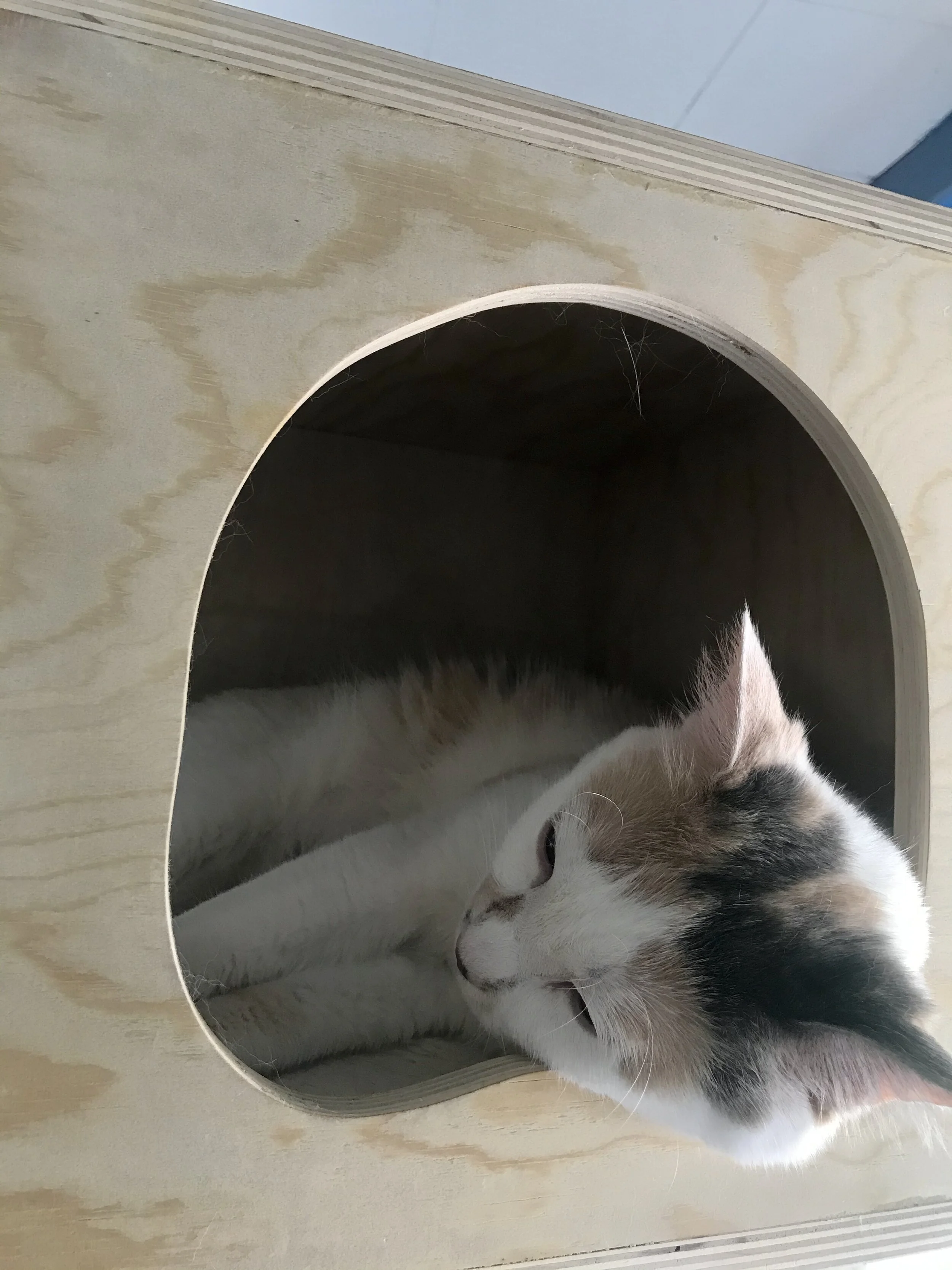 The first wooden cat house that is a must is this scalloped shingle pine plywood house and scratching tower. I have a deep love for victorian homes, especially when they are clad in fish scale or scalloped shingles and the scalloped felt shingles evoke that wonderful historic house feeling for me. This cat home also has Scandinavian dollhouse vibes, embodying the danish concept of hygge or hyggelig (adj.) referring to finding comfort and warmth in a cozy atmosphere. So I’m already imagining my kitties in full contentment in the bottom level intertwined and grooming, with another kitty atop sleeping or keeping watch, solo, happy to nestle above, but near her sisters.