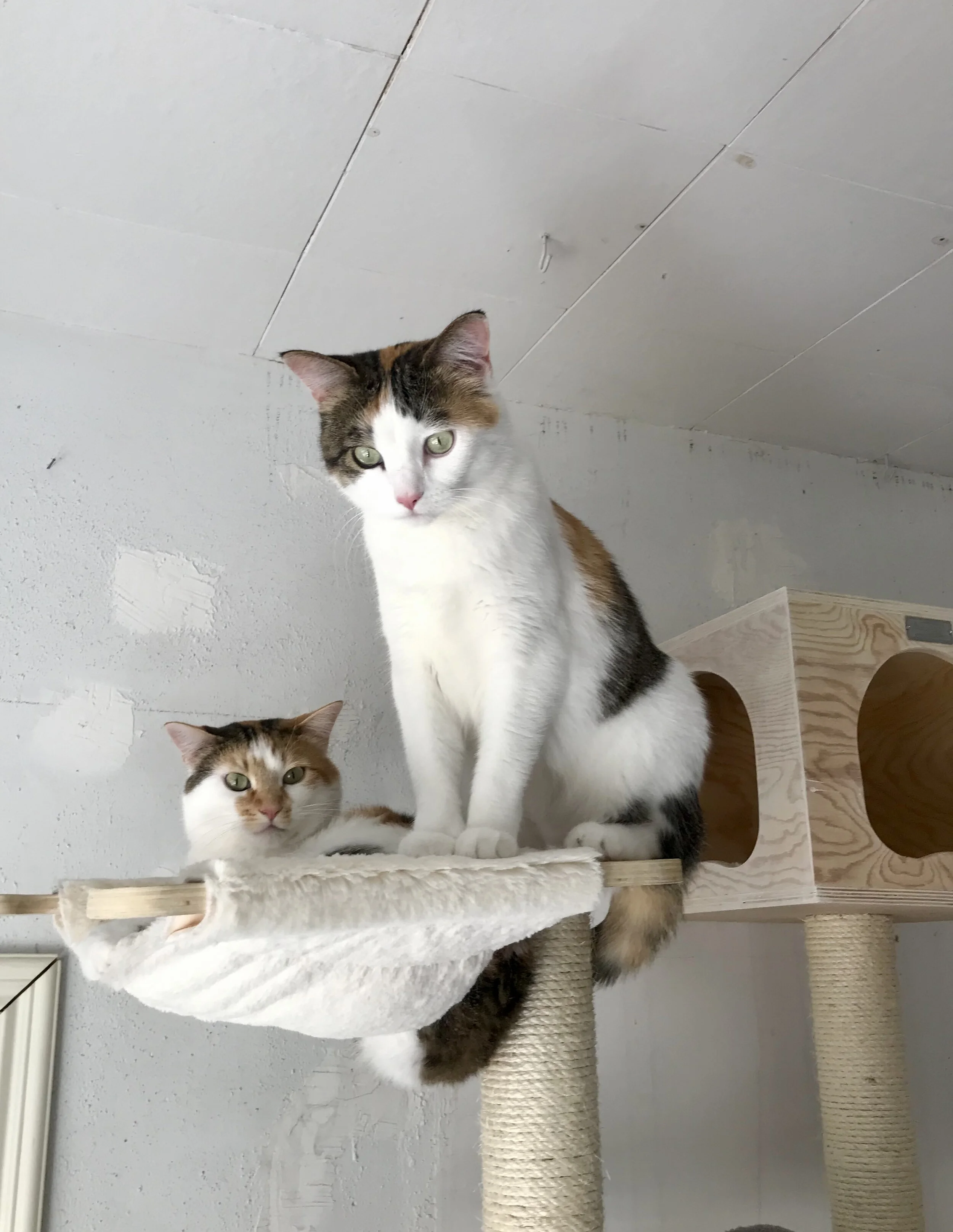 Ranger and Viktoriya sky high in their Armarkat 89" Solid Wood Cat Tree. Good thing this tree is well built and solid enough to support two adult kitties on the hammock perch.
