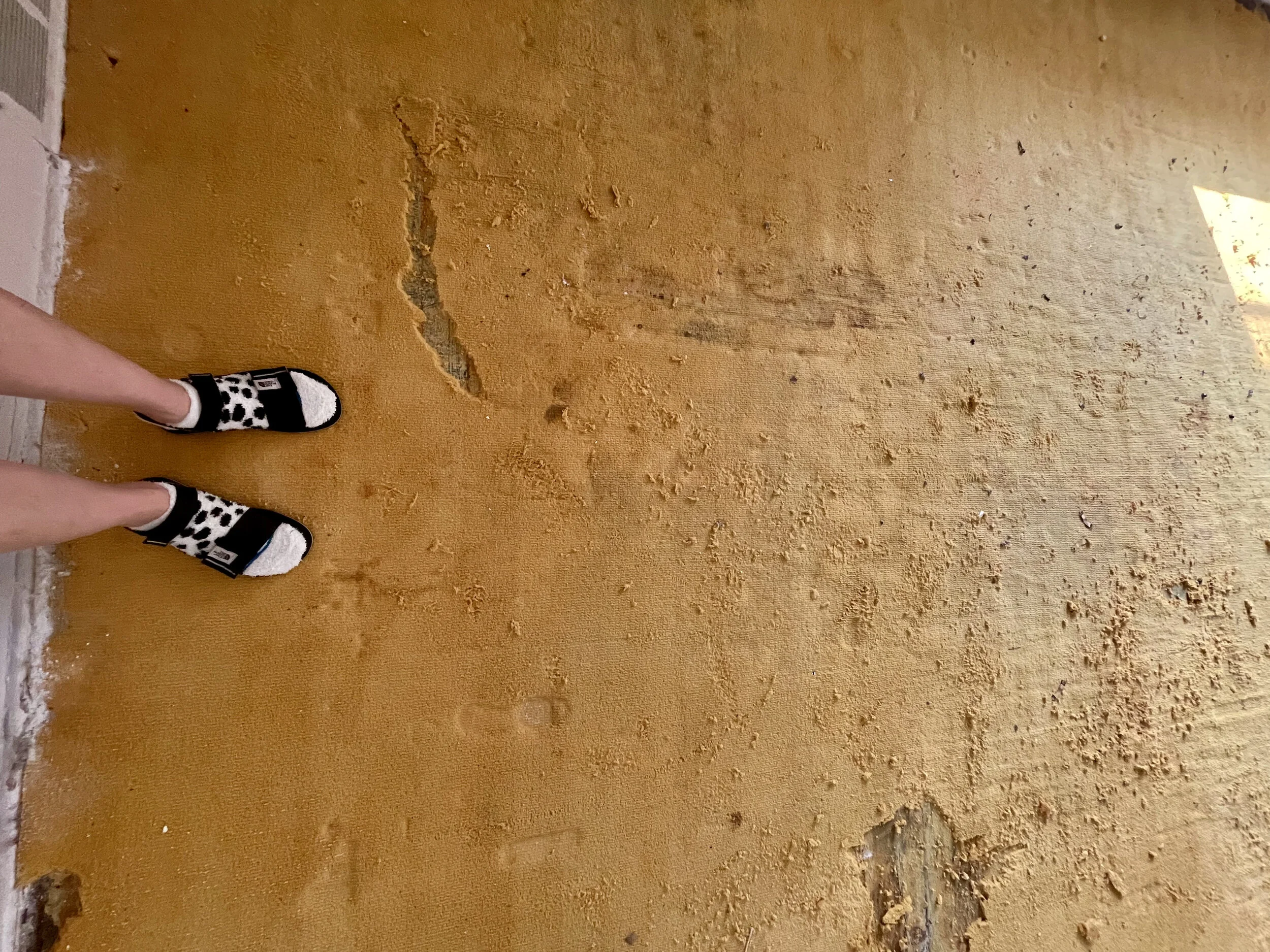 The afore mentioned crumbling mustard carpet pad. I’m not sure how a material this low grade was ever permitted to be installed in a living space.